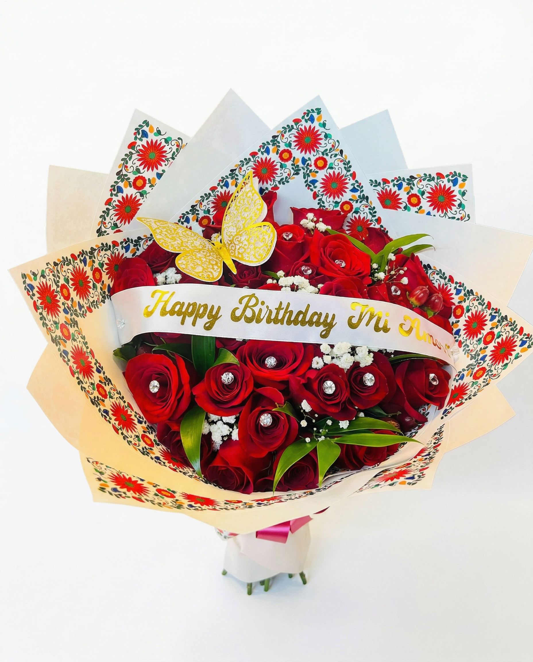 Mensaje de Oro: Incluye una elegante banda de satén blanco con la frase “Happy Birthday Mi Amor” grabada en vinilo dorado de alta calidad.