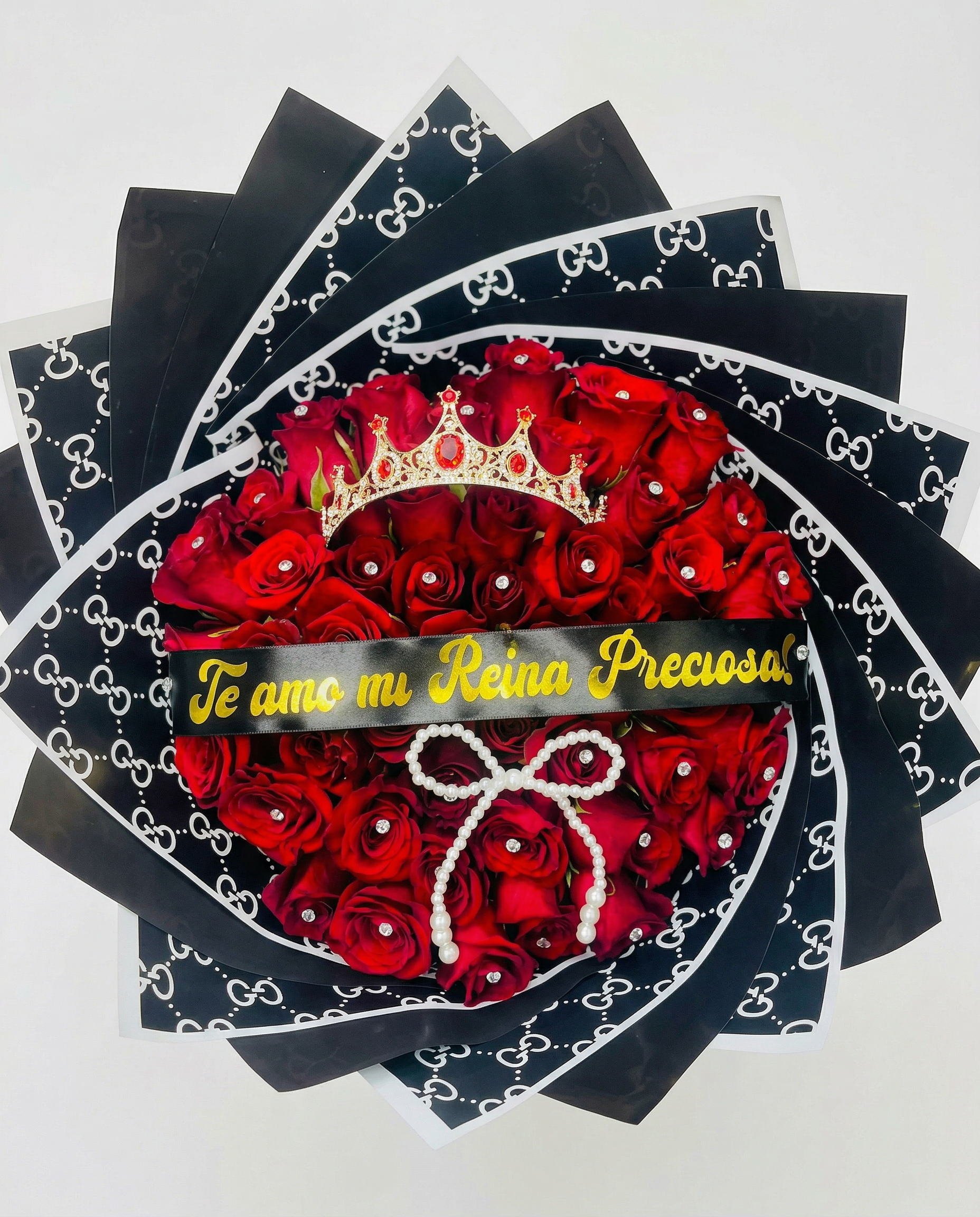 Banda de Gala: Una cinta de satén negro atraviesa el ramo con la frase “Te amo mi Reina Preciosa!” grabada en caligrafía dorada metálica.