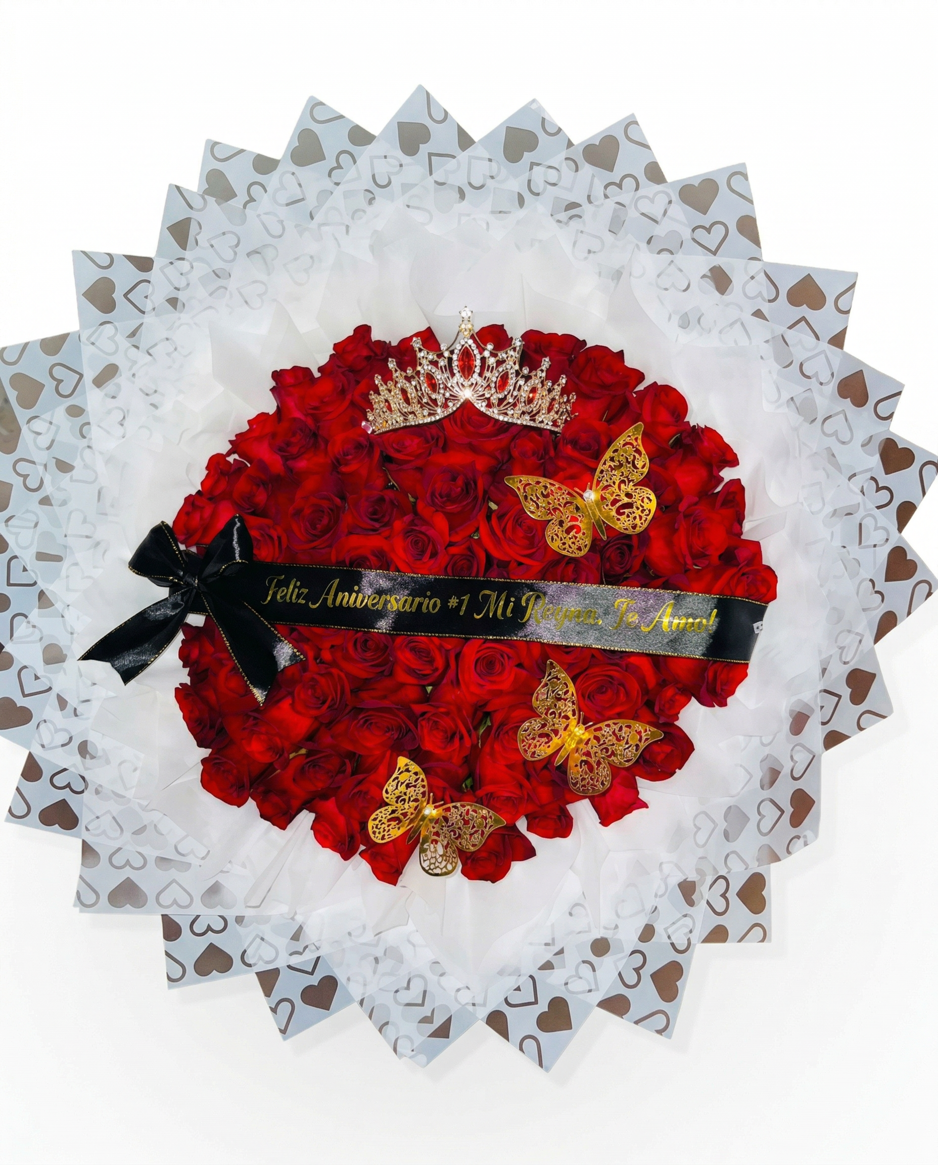 Acentos de Mariposas Monarca: El ramo cuenta con tres mariposas de diseño calado en color oro, cada una decorada con una pequeña perla central, aportando una sensación de movimiento y delicadeza.