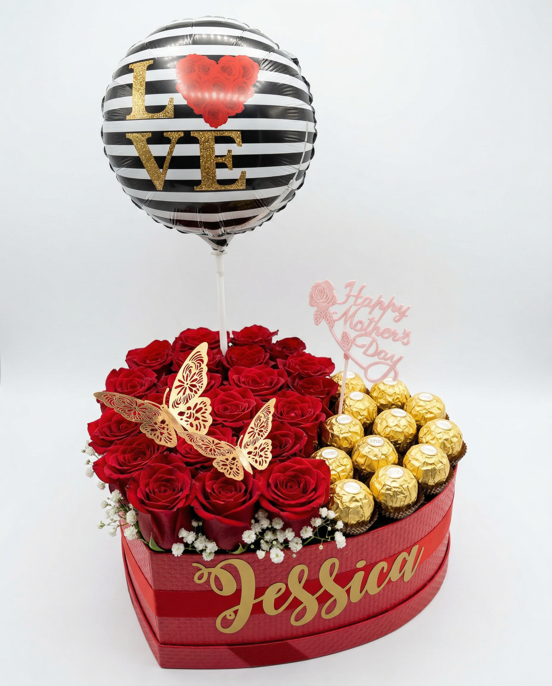 Globo “Love” de Vanguardia: Coronando el arreglo, un globo metálico con diseño de rayas blancas y negras aporta un toque de moda y modernidad.