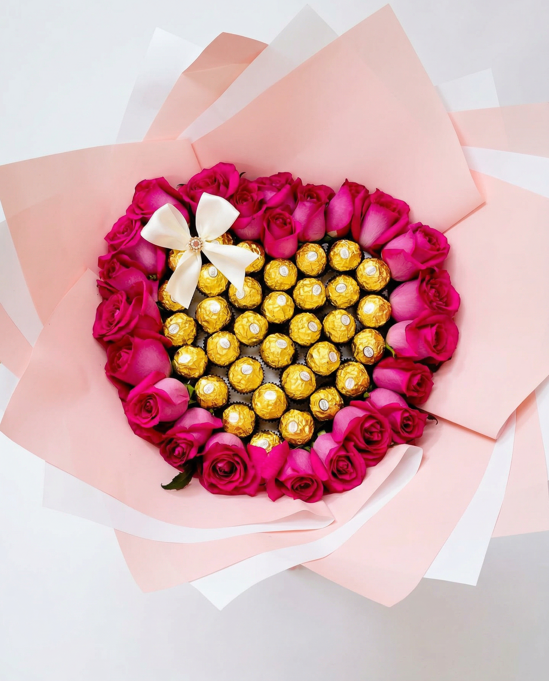 • Opción Gourmet: Corazón central de rosas con laterales de fresas bañadas.