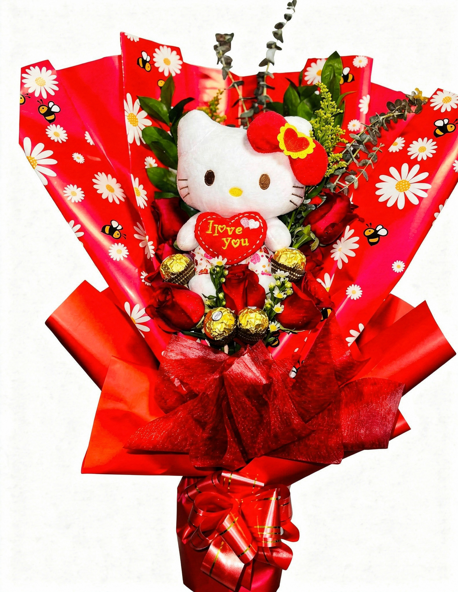 El arreglo “Kitty Luxury” redefine el concepto de ramos con peluches. Al integrar elementos de moda de alta gama con el personaje más icónico de Sanrio, este diseño logra un equilibrio único entre lo dulce y lo exclusivo.
