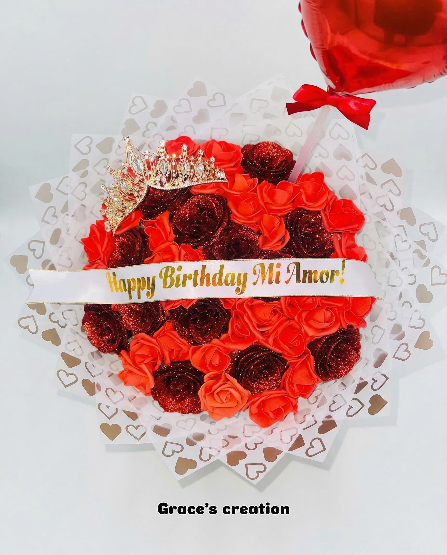 El arreglo está coronado con una tiara brillante de cristales, simbolizando la importancia de esa persona especial. Envuelto en un delicado papel decorativo con detalles de corazones y acompañado por un globo metálico rojo, este ramo incluye una banda personalizada con la frase “Happy Birthday Mi Amor” en letras doradas, convirtiéndolo en el regalo definitivo para un cumpleaños inolvidable.
